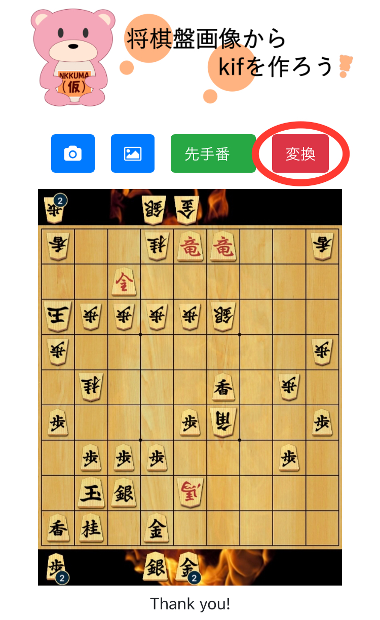 ShogiBan to Kifを開いて、赤丸部分をタップして保存した画像をアップします。